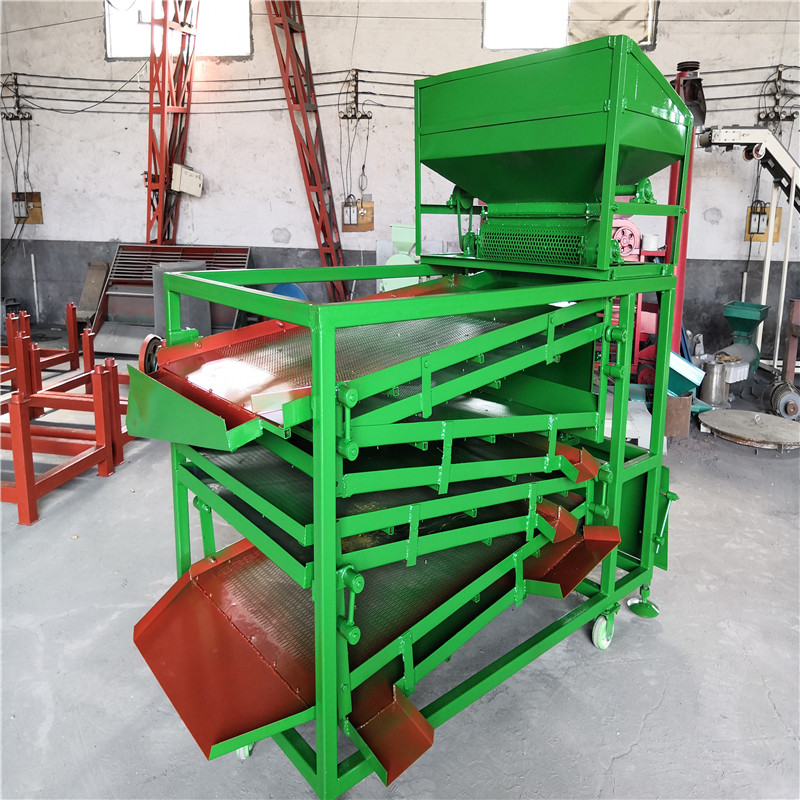 將花椒放入進料口---------進料口下方有一個分離器將花椒耙籽殼分離開--------分離的混合物料落入回旋篩--------回旋篩分為3層-------一層出料霉花椒、花椒葉、花椒枝-----一層復式篩網篩的是花椒枝----------二層為花椒枝出料口-------復式篩網為花椒籽出料口--------花椒籽出來時有風機可以增加花椒籽的凈度。提高花椒凈度---------底層出來的是花椒殼