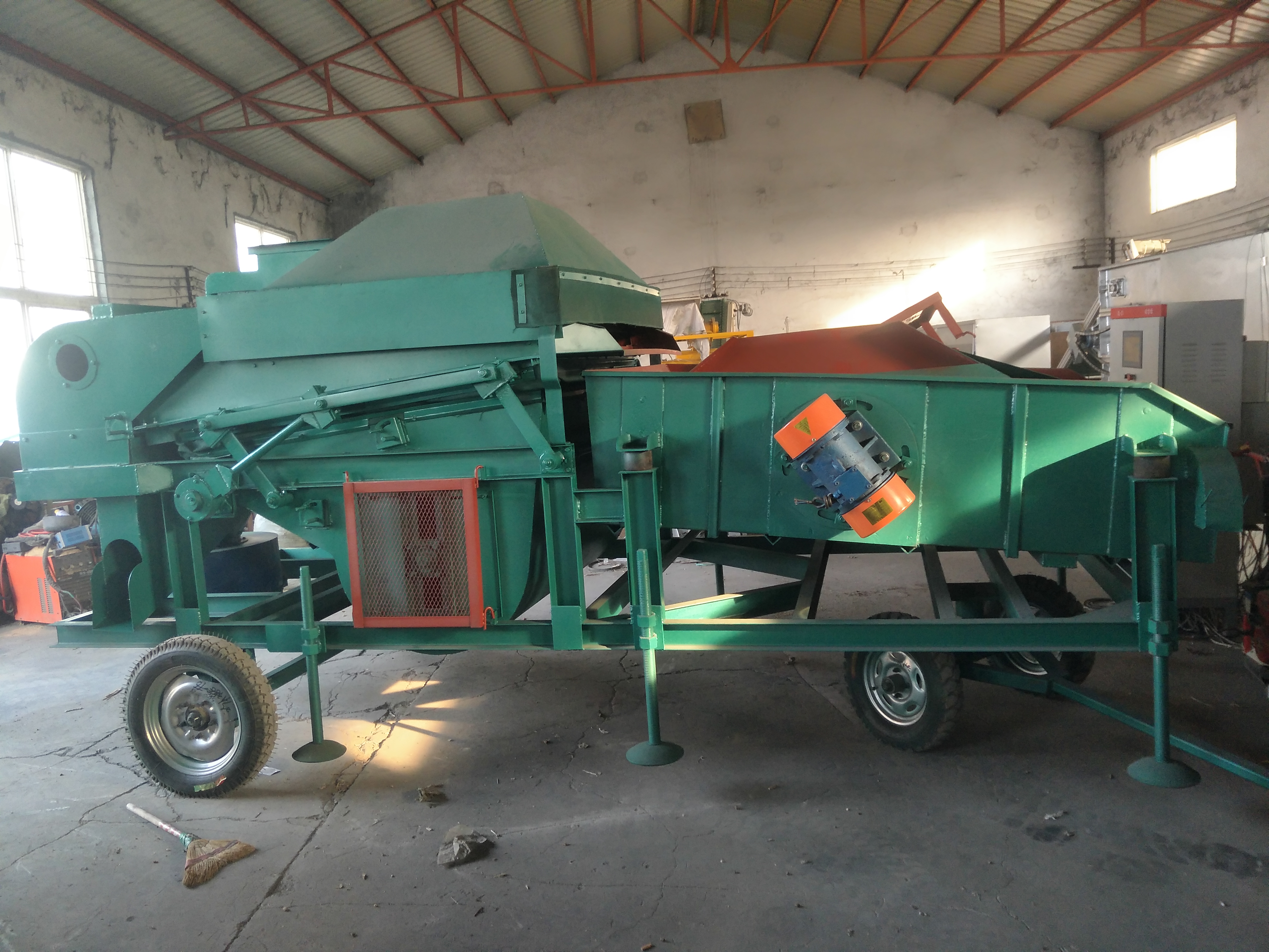 本機(jī)由機(jī)架及運(yùn)輸輪,傳動(dòng)部分,主風(fēng)機(jī)、重力分離臺(tái)、吸風(fēng)機(jī)、吸風(fēng)道、篩箱等組成,移動(dòng)靈活,更換篩板方便、性能良好等特點(diǎn)。