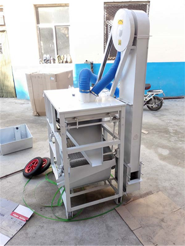 本機為三層篩網,先經過進料口處風機抽風,直接抽走重量輕的雜葉或麥秸稈,上層篩的初次篩分再把大雜清理過,好的糧食(種子)直接落到下層篩網上,下層篩網會把糧食(種子)中的小雜.小石子.有缺陷的糧食(種子)直接漏掉,完好的糧食(種子)會從出料口篩分出來。該小型清糧機解決了揚場機的功能單一,不能有效去除石子.土塊的缺陷,更能為清理、凈選糧食(種子)帶來滿意的效果。該機有占地小,移動方便,便以維修,除塵除雜效率明顯,能耗低,使用簡便等優點。