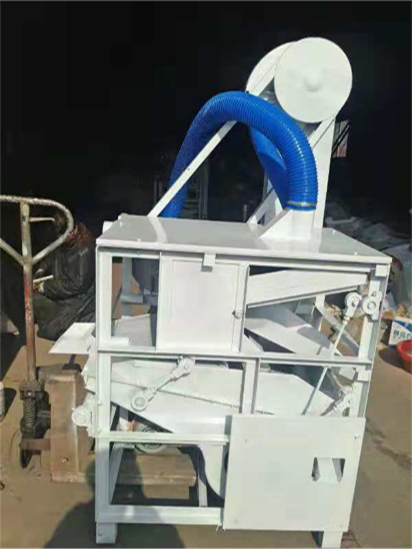 本機為三層篩網,先經過進料口處風機抽風,直接抽走重量輕的雜葉或麥秸稈,上層篩的初次篩分再把大雜清理過,好的糧食(種子)直接落到下層篩網上,下層篩網會把糧食(種子)中的小雜.小石子.有缺陷的糧食(種子)直接漏掉,完好的糧食(種子)會從出料口篩分出來。該小型清糧機解決了揚場機的功能單一,不能有效去除石子.土塊的缺陷,更能為清理、凈選糧食(種子)帶來滿意的效果。該機有占地小,移動方便,便以維修,除塵除雜效率明顯,能耗低,使用簡便等優點。